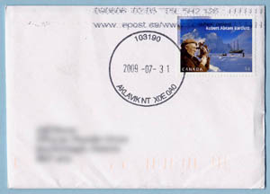 The covers on this page are the best of the bunch I received during 2009. In general, bilingual rectangular cancels, particularly those from Nunavut, always seemed to be placed completely over the stamps. And several covers with the Barlett commemorative turned out illegible. Even so, they all have a place in my collection.