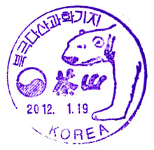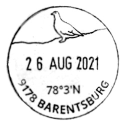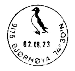Bjørnøya (74°31'N 19°01'E) is the southernmost island of the Svalbard archipelago. It was declared a nature reserve in 2002 and is only inhabitied by the year-round staff of the Herwighamna weather station. (there are links on their webpage to some interesting Bjørnøya related blogs). The station post office was closed in 2002 but reopened in 2005. At one time they used a pictorial postmark with an artic loon on it. But a recent cover that came to me from the island had the usual circular cancellation and the pictorial postmark as well. Their postal code is 9176.