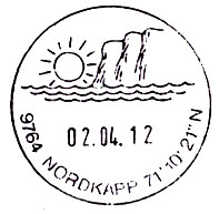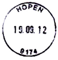 Hopen (76°33'N 25°7'E) is a Small island in the south-east of the Svalbard archipelago. A small weather station exists on the island that is manned by a staff or four for six months at a time. They are assisted by a team of dogs who warn them when polar bears are near by. Despite its size and isolation, there has been postal service at the station since 1986. The post office here was closed between 2002 and 2005. The old postmark had a walrus on it but now it's just the usually round-style Norwegian postmark. Hopen's postal code is 9174.