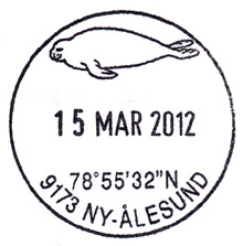 All mail to and from Ny-Ålesund goes through Longyearbyen. The mail can take a while to get through in the winter. And many of the research bases shutdown during the non-summer months. The Ny-Ålesund postmark, which was recently replaced (March 2012), features a seal. Ny-Ålesund's postal code is 9173.