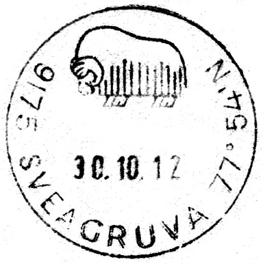 Sveagruva (77°54'N 16°43'E) is a mining settlement on Spitsbergen island, 60km south of Longyearbyen. It is the largest coal mine on the island and employs over 300 people who all live in Longyearbyen. Store Norske Spitsbergen Kulkompani owns and operates the mine. Nobody permanently lives in Svea and yet for some reason, they have a post office there. The animal on the Svea postmark is a muskox and the postal code is 9175.